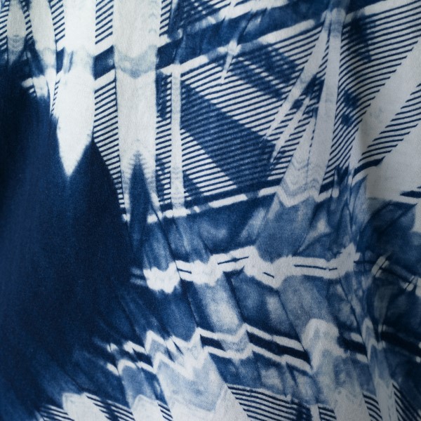 KOSOEN employs a centuries-old natural indigo lye-fermentation method from the Edo (1603-1868) period, which was the golden age of Japanese indigo dyeing. They procure sukumo, the raw material for natural indigo dyeing made by drying and fermenting the leaves of the polygonum tinctorium indigo plant, from artisans in Tokushima. In the workshop, they add ash lye and wheat bran, and the mixture is stirred in a vat morning and night to produce a slow fermentation. Given the challenging and time-consuming nature of managing the naturally fermented indigo dye, modern methods often use chemical agents to achieve results more quickly. However, natural indigo has a clarity and depth unattainable with chemical dyes. Repeated dyeing coats the fabric with collagen, making it durable and resistant to fading. Additionally, natural indigo is said to have antibacterial, antimicrobial, and UV-protection properties. For these reasons, KOSOEN continues to use the traditional, labor-intensive dyeing method for their products, presenting twice-yearly apparel collections of stoles, shirts, dresses and more, featuring beautiful tie-dye and gradient effects, and receiving numerous orders from well-known brands.