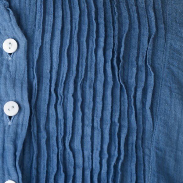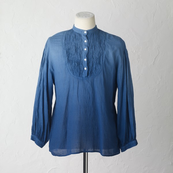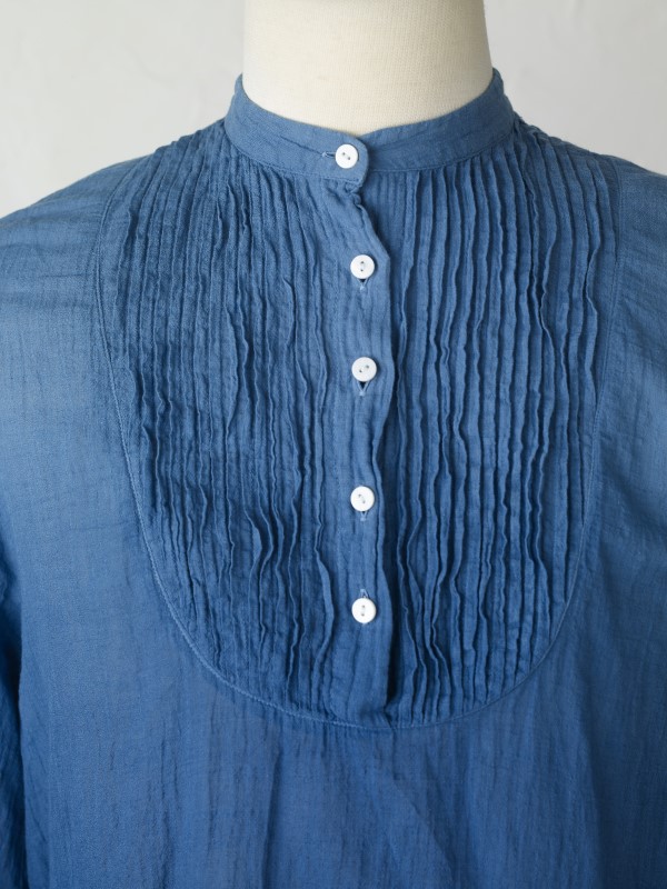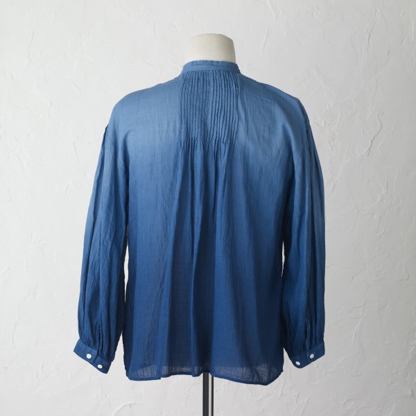KOSOEN employs a centuries-old natural indigo lye-fermentation method from the Edo (1603-1868) period, which was the golden age of Japanese indigo dyeing. They procure sukumo, the raw material for natural indigo dyeing made by drying and fermenting the leaves of the polygonum tinctorium indigo plant, from artisans in Tokushima. In the workshop, they add ash lye and wheat bran, and the mixture is stirred in a vat morning and night to produce a slow fermentation. Given the challenging and time-consuming nature of managing the naturally fermented indigo dye, modern methods often use chemical agents to achieve results more quickly. However, natural indigo has a clarity and depth unattainable with chemical dyes. Repeated dyeing coats the fabric with collagen, making it durable and resistant to fading. Additionally, natural indigo is said to have antibacterial, antimicrobial, and UV-protection properties. For these reasons, KOSOEN continues to use the traditional, labor-intensive dyeing method for their products, presenting twice-yearly apparel collections of stoles, shirts, dresses and more, featuring beautiful tie-dye and gradient effects, and receiving numerous orders from well-known brands.