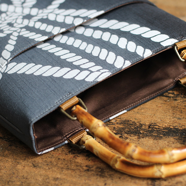 This is a product that showcases the artisan skills of Torigoeno Shibata, who combines Edozome dyed patterns from yukata (summer cotton kimono) fabrics to create handbags.