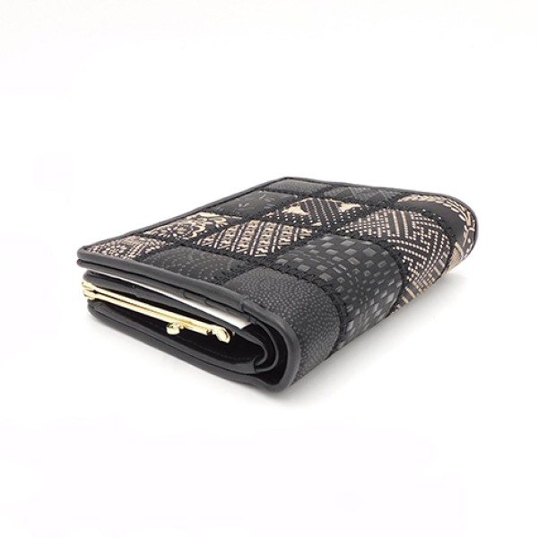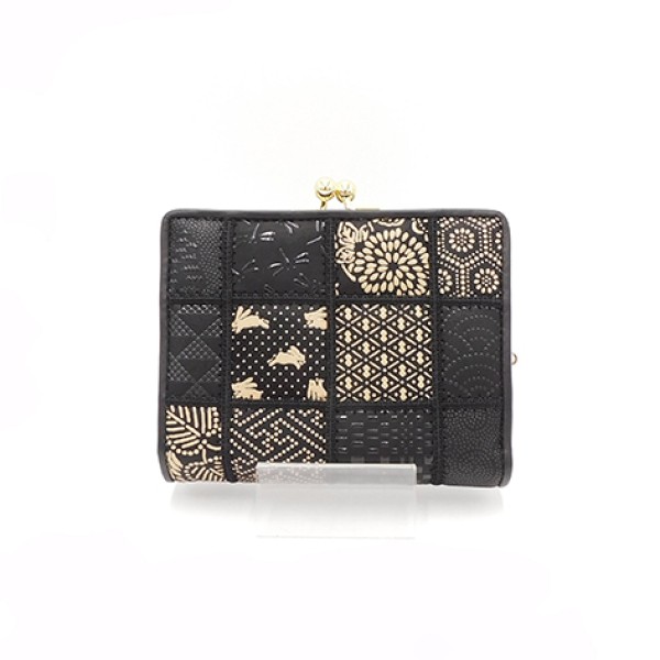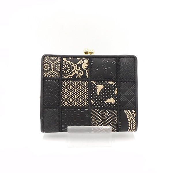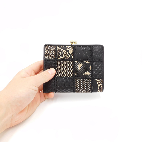 An exquisite wallet with a classic gamaguchi clasp, delicately decorated with Maekawa-Inden's signature patchwork inden (traditional Japanese leatherworking).