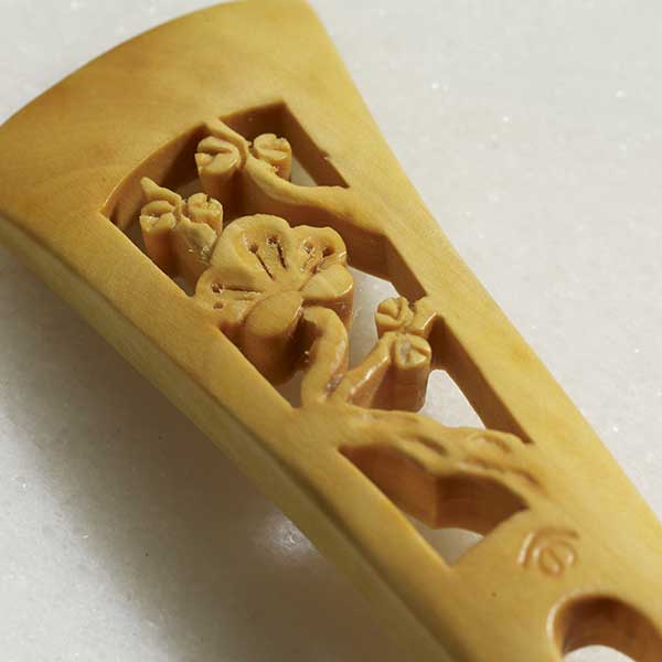 A small kanzashi (a traditional Japanese hair ornament) made from boxwood trees, originating from Satsuma. It features a motif of plum blossoms.