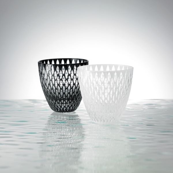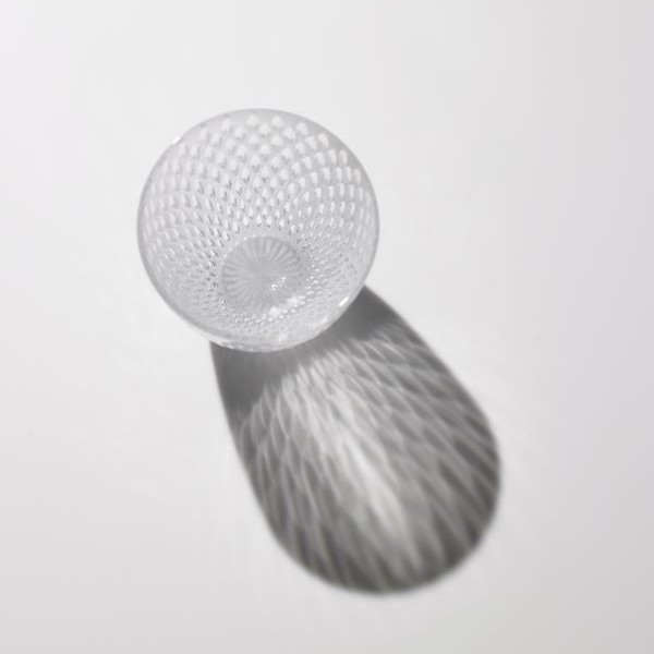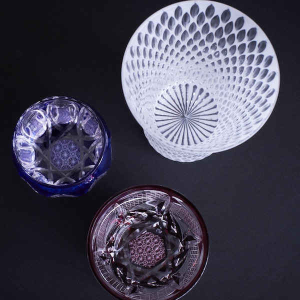 Glasswear featuring Hanashyo's original pattern called Kome Tsunagi (rice links).