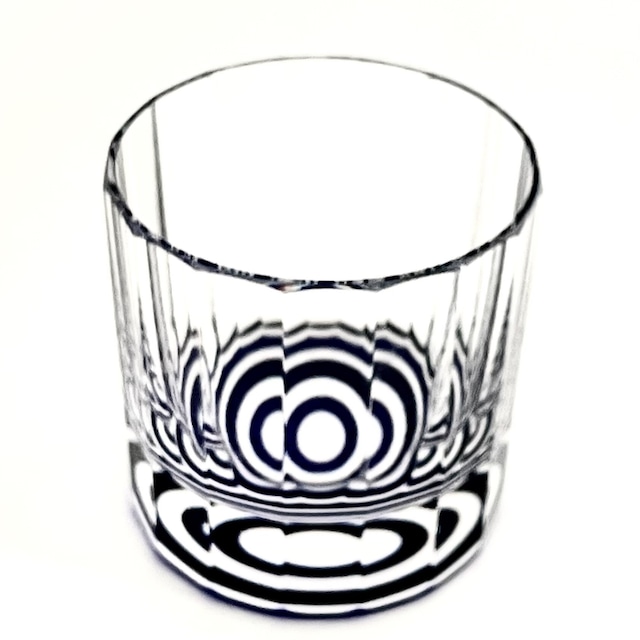 A completely new style of Edo kiriko was born through the combination of these two techniques. The sides of the flashed glass (two-layer glass consisting of a transparent glass covered with a lapis blue or red coloured glass) are cut flat on 16 sides and polished until transparent. The bottom of the sake cup is sandblasted with a janome (snake eye) ring pattern, a typical pattern of sake tasting cups. This Edo kiriko piece is specially designed for Japanese sake. Pouring a drink will cause the 16 polished faces of the glass to reflect the ring pattern on the base like a kaleidoscope, giving it a new look every time you pick it up.
