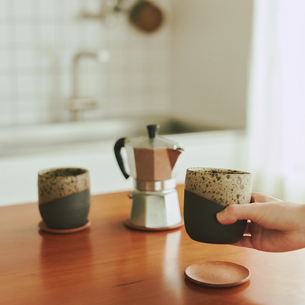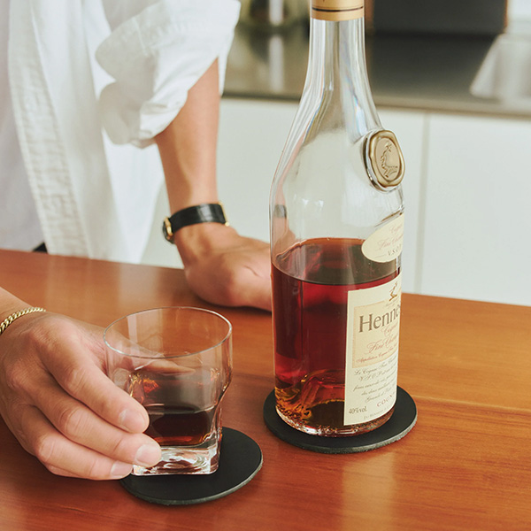 These leather coasters bring warmth to the dining table. Although leather is often thought to be unsuitable for contact with water, when exposed to droplets it actually hardens slightly, developing a more stable texture. The marks left by the water form ring-like patterns reminiscent of tree rings, creating a unique character that evolves with each use. Available in two colours: black and natural. They are also ideal for larger mugs and wine bottles.