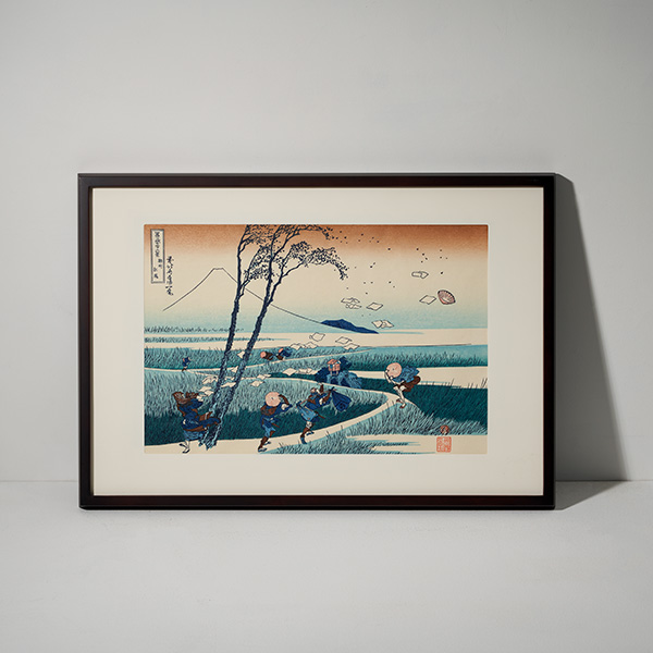 The work depicts people struggling along a winding embankment in the face of powerful winds. This is an excellent example of Hokusai's work. Wind is traditionally considered difficult to render, but he has conveyed the force of the gale magnificently by showing papers and straw hats blown into the air.