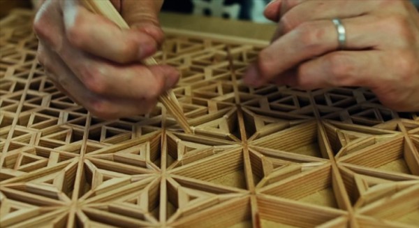 Production of delicate, intricate kumiko fretwork begins with selection of high-quality wood. The workshop mainly uses Kiso cypress, Akita cedar, and Aomori cypress, the three most renowned timbers in Japan. The wood is cut into thin strips, and then grooved, drilled, and tenoned before assembly. First, a large frame is formed by assembling a lattice or lozenge shapes, and then the smaller pieces of wood are fitted into each crosspiece to form the pattern. However, "Even a 0.1 mm error is not tolerated," says Tanaka. He regularly holds sales demonstrations at department stores throughout Japan, in the hope that people will learn more about the depth of this sophisticated craft.