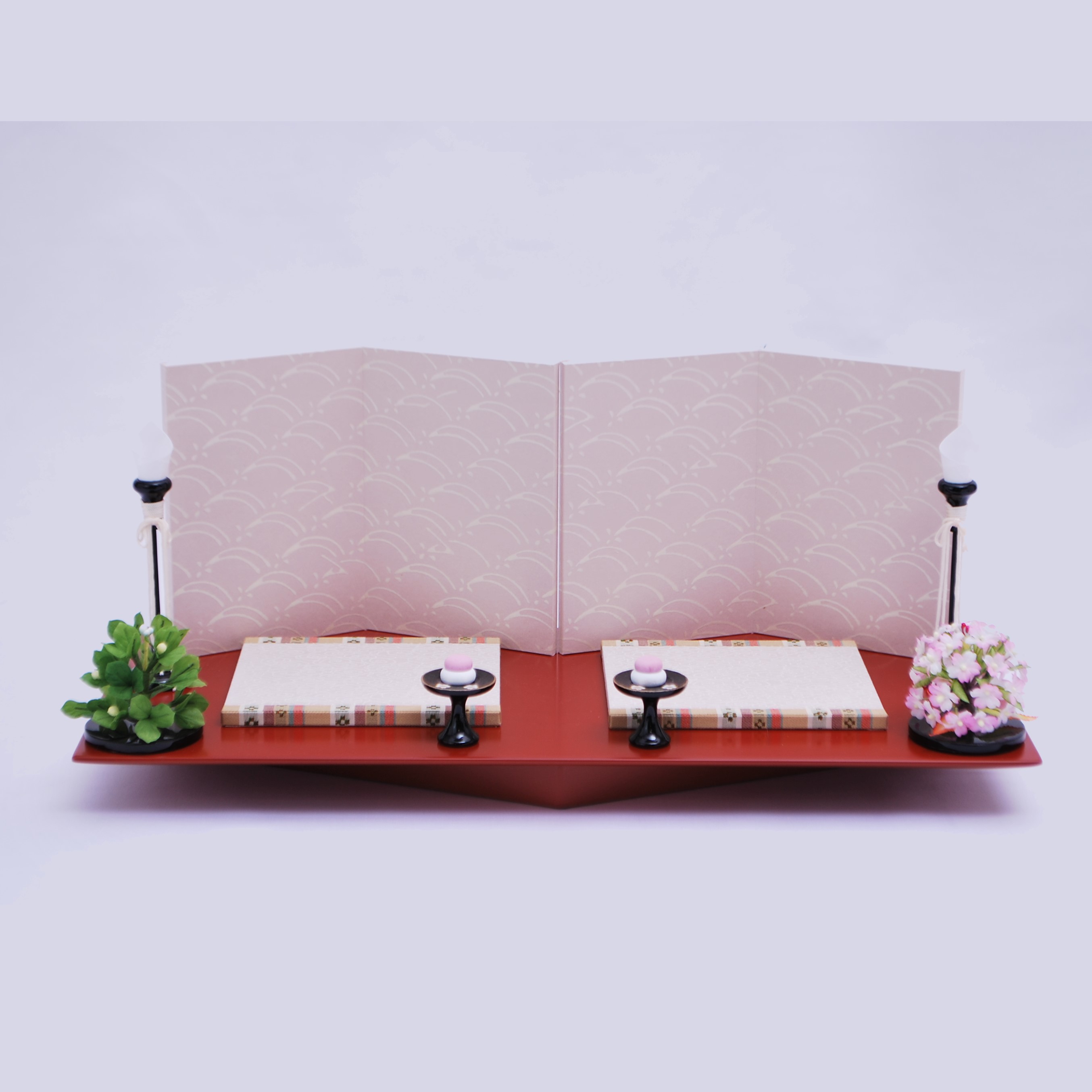 The candlesticks and hokai (portable food containers), which adorn the vermilion-lacquered stand alongside the dolls and folding screen, are also handmade by artisans.