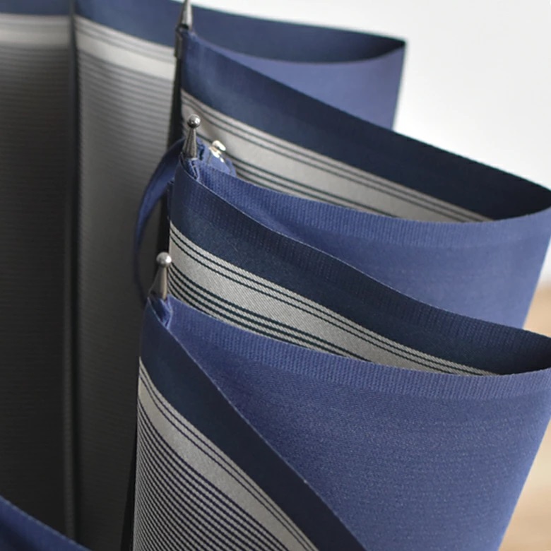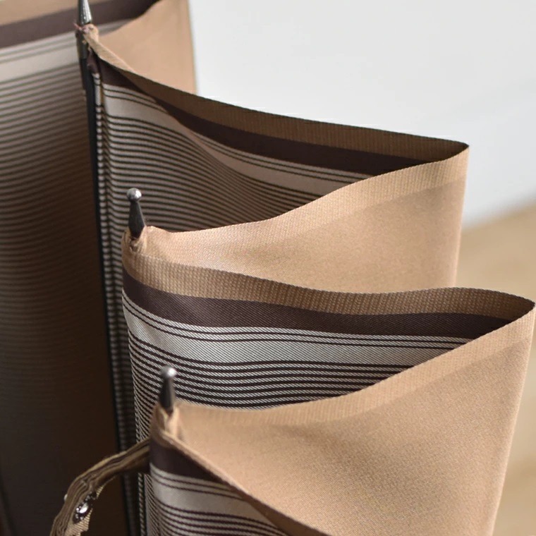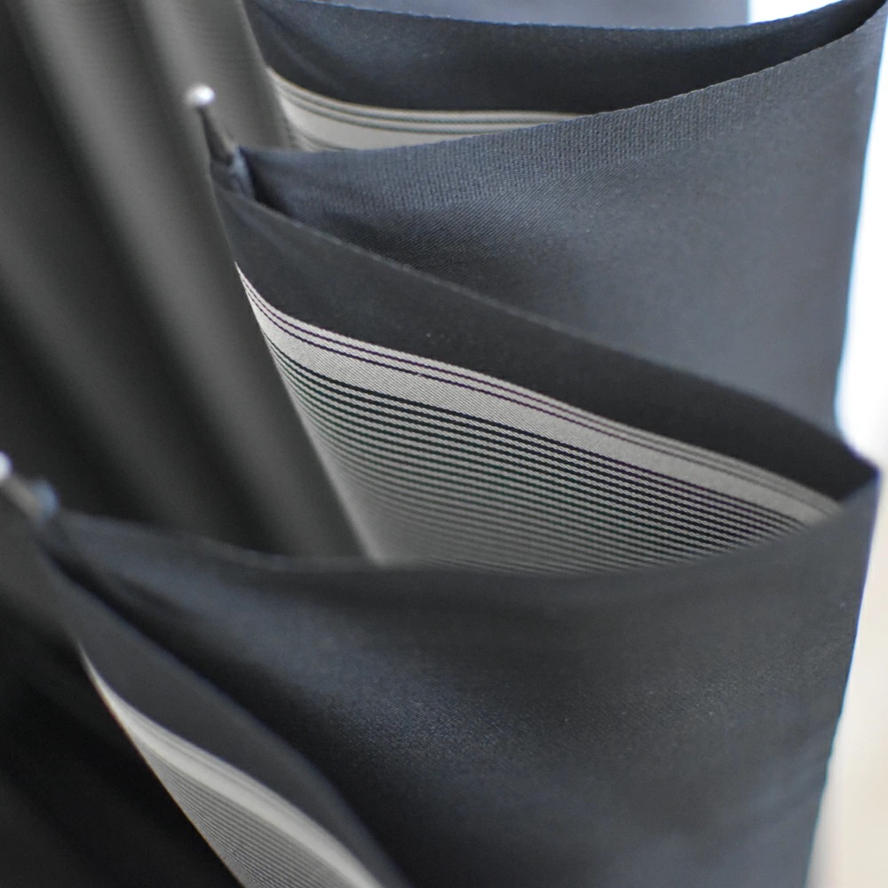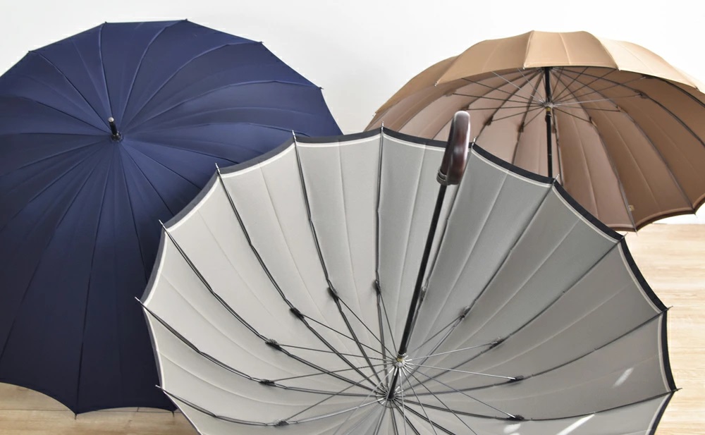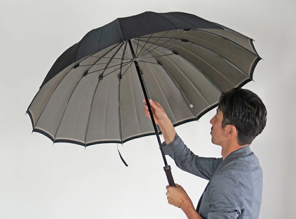 The border stripe that can be seen when the umbrella is open accentuates the beautiful shape of the 16-rib canopy that has been crafted by artisans into a refined full-length umbrella. The large number of ribs gives the umbrella broad coverage and an impressively elegant shape when it is open.