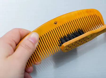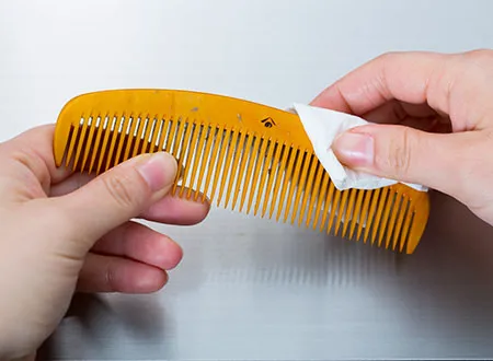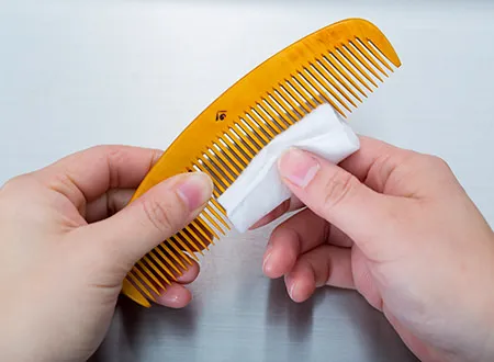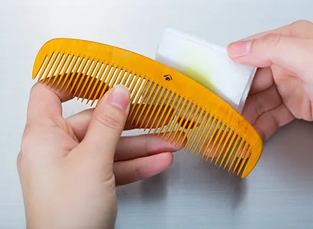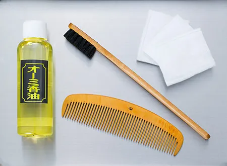 Boxwood Comb Care Items necessary ・Brush for care (a toothbrush is okay) ・Camellia oil or other natural plant oils for hair and skin, such as jojoba or argan oil Step 01 Soak a cotton swab or tissue in Camellia oil and brush down the comb. 02 Make sure to thoroughly soak the teeth of the comb. 03 The debris will flush out from between the teeth along with Camellia oil; wipe clean with a tissue. 04 The debris will flush out from between the teeth along with Camellia oil; wipe clean with a tissue. Repeating the steps above once every 2 – 3 months will preserve the life of your comb for many years to come.